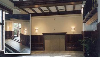 Demolition and re-construction of front entry and vestibule. ADA accesses, HVAC, electric, plumbing, custom-matched oak panels, woodbeam/purlin ceiling assembly, wrought iron railings, and fire alarm system.
