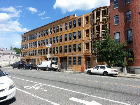 New construction of multi-family apartments 1,2,3 bedroom units. HVAC system, life safety systems, city utility connections rear Piazzetta amenity, rooftop decks with city landscape views of downtown Boston. New construction was placed on the sidewalk line with pedestrian protection during all operations. Piles support the structural grade beam foundation.