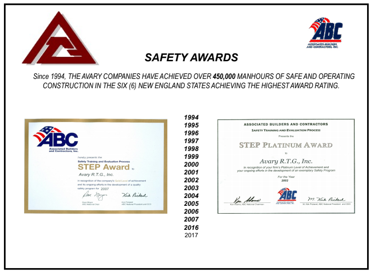 Avary R.T.G., Inc. is pleased to announce that we have had 668,780 man hours with no lost time accidents. 15 straight years of maintaining our jobsite with safety as our #1 priority. Avary R.T.G., Inc. thanks all employees for this outstanding safety record. Safety is more than injury prevention and code compliance, it is protecting the well-being and satisfaction of our employees, and ensuring the efficiency and quality of our workmanship. In 2002, we earned an award from the Associated Builders and Contractors for surpassing 290,000 hours or 7,250 employee weeks without LOST TIME. This award is the most recent milestone in an exemplary safety record spanning 10 years. In 2012, Avary RTG, Inc has achieved a milestone with over 668,000 manhours with no lost time work related accidents, or 16,700 work weeks without a major accident. The ABC has granted us a safety award every year since 1994, including the: